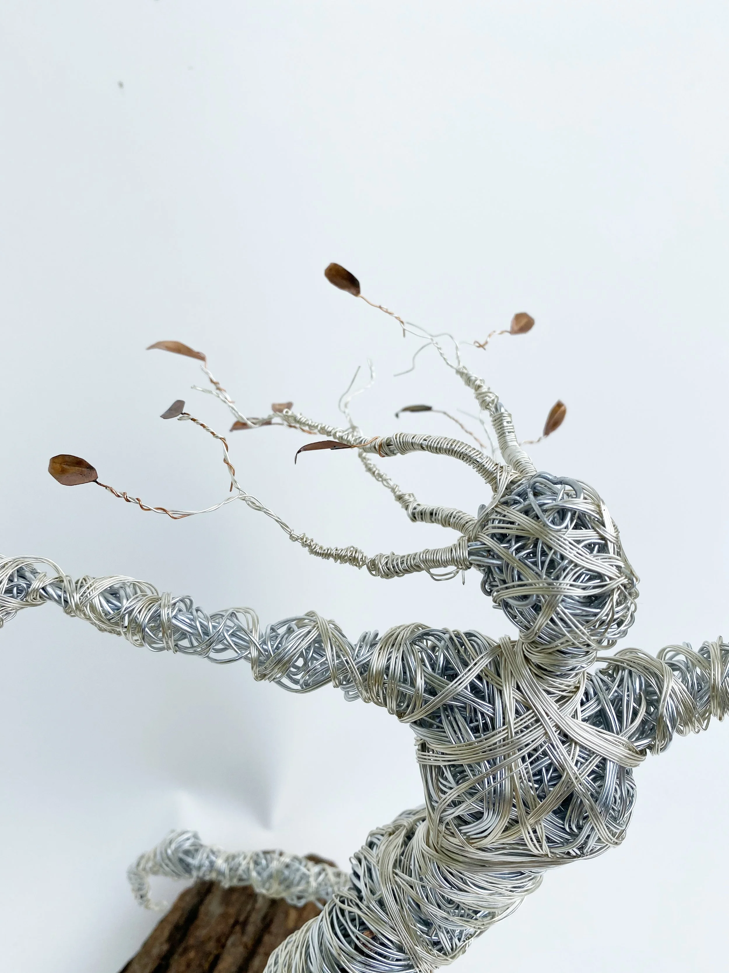 Dance of there Dryad is constructed of aluminum and copper wire, bronze sheeting, and wood. The sculpture stands 14” tall, and was created in 2020.